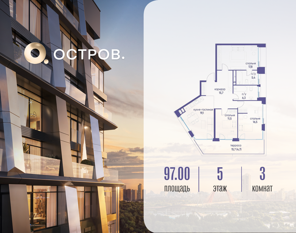 Продаётся трехкомнатная квартира от застройщика: общая площадь 97.02 м², жилая 45.80 м², кухня 19.10 м², 5, жилой квартал «Остров 12», корпус 1 (12.1 квартал) (секция 1). срок сдачи: 4-кв. 2025. , 2 санузла: 2 совмещенных. В жилой зоне 2 больших окна на одну сторону, хорошая инсоляция. Позвоните сейчас и забронируйте квартиру! Купите квартиру для курортной жизни в Москве в квартале ОСТРОВ.12.1. Это единственный на ОСТРОВЕ квартал бизнес-класса, расположенный на первой линии у реки - здесь царит атмосфера ежедневного отпуска. Дома созданы в узнаваемом футуристичном стиле и выглядят как произведения современного искусства. Для жителей предусмотрены фитнес-рум и детский клуб, гостиная и кинотеатр, переговорные и репетиторские комнаты. На крышах устроены видовые общественные пространства с зонами для йоги, коворкингами, лаунжами. Двор-парк располагает всем необходимым для отдыха и общения всех возрастов. ОСТРОВ.12.1 - часть жилого комплекса на западе Москвы, в 15 минутах езды от центра. Это настоящий заповедник посреди большого города, в окружении реки и 650 га заповедников. Здесь все необходимое находится по соседству: от детского сада до супермаркета, от фитнес-зала до серфинг-центра. На территории созданы все условия для отдыха и общения: клубная инфраструктура в домах и дворы-парки, набережные и променады, маршруты для спортсменов, детей и возрастных жителей. В нескольких минутах ходьбы расположена станция метро "Мнёвники" БКЛ. На автомобиле - 10 минут до Москва-Сити и 15 минут до Садового кольца.