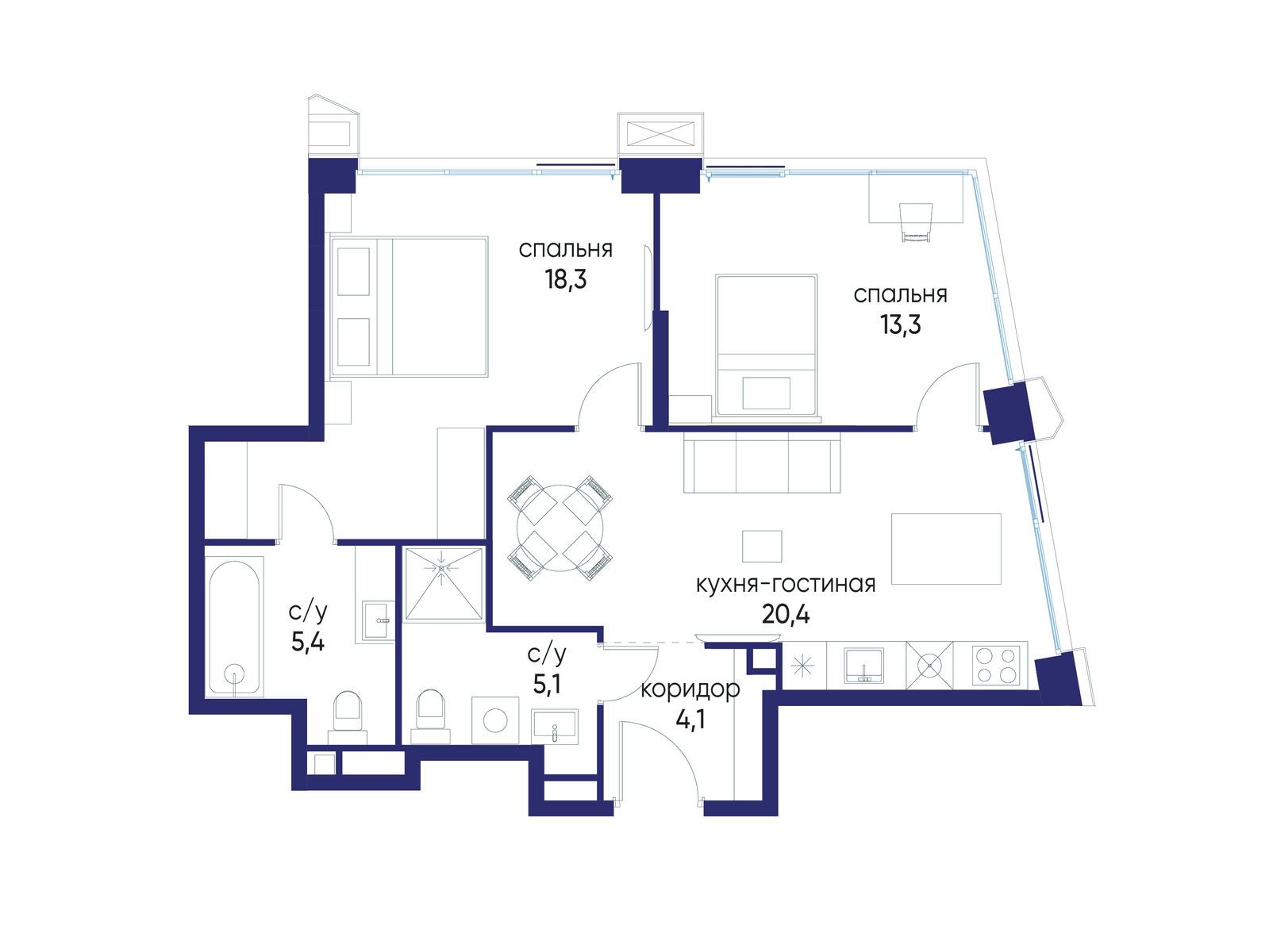- Площадь кухни 20.4 м²