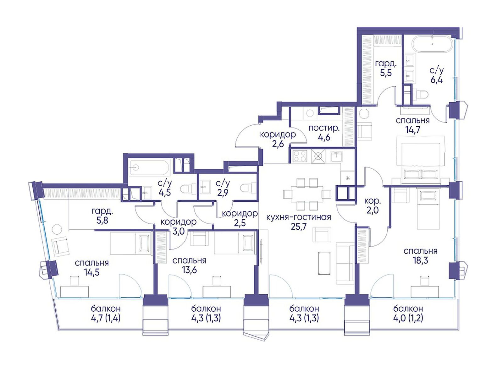 - Площадь кухни 25.7 м²