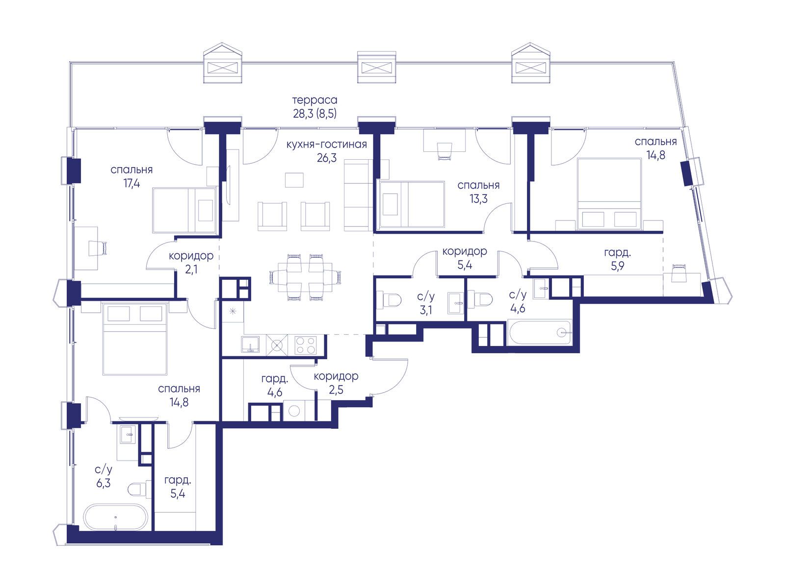 - Площадь кухни 26.3 м²