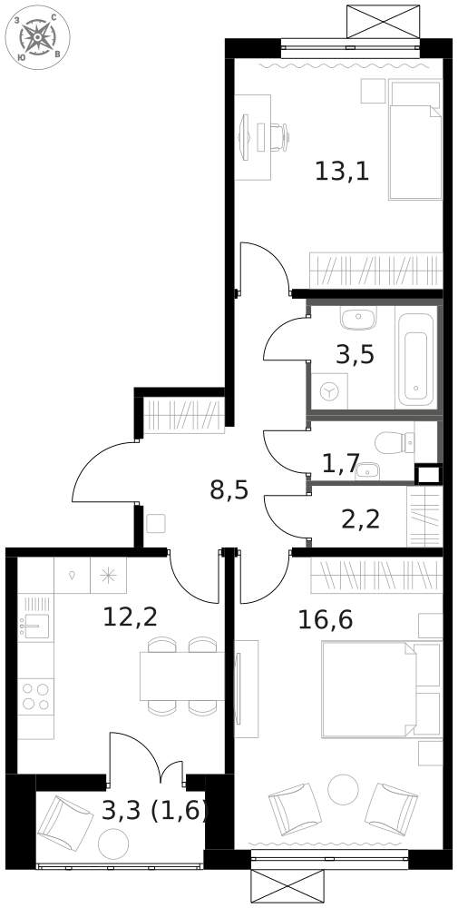- Площадь кухни 12.2 м²