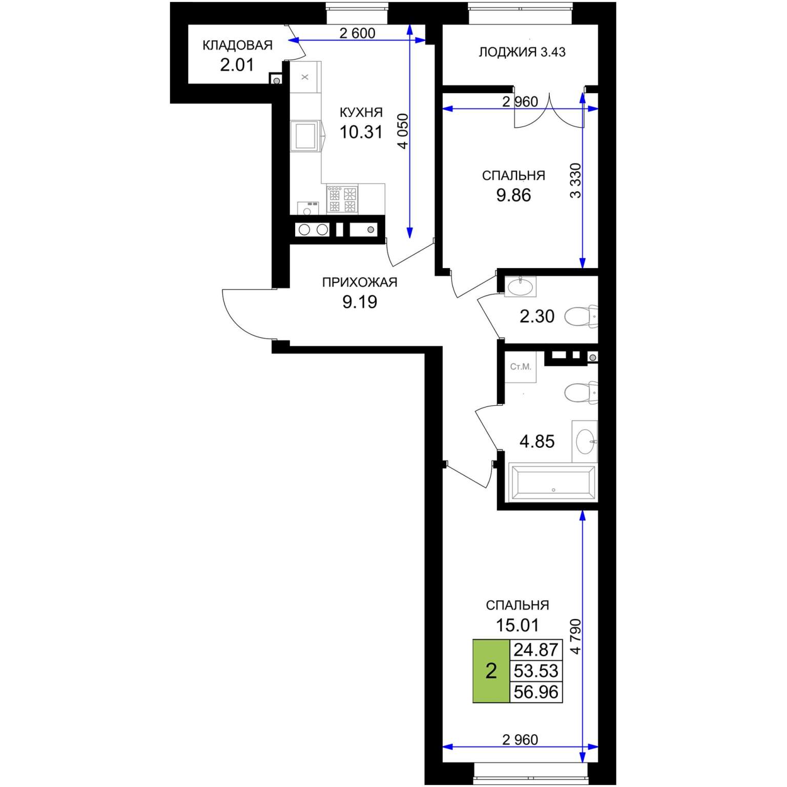 - Общая площадь 55.25 м²