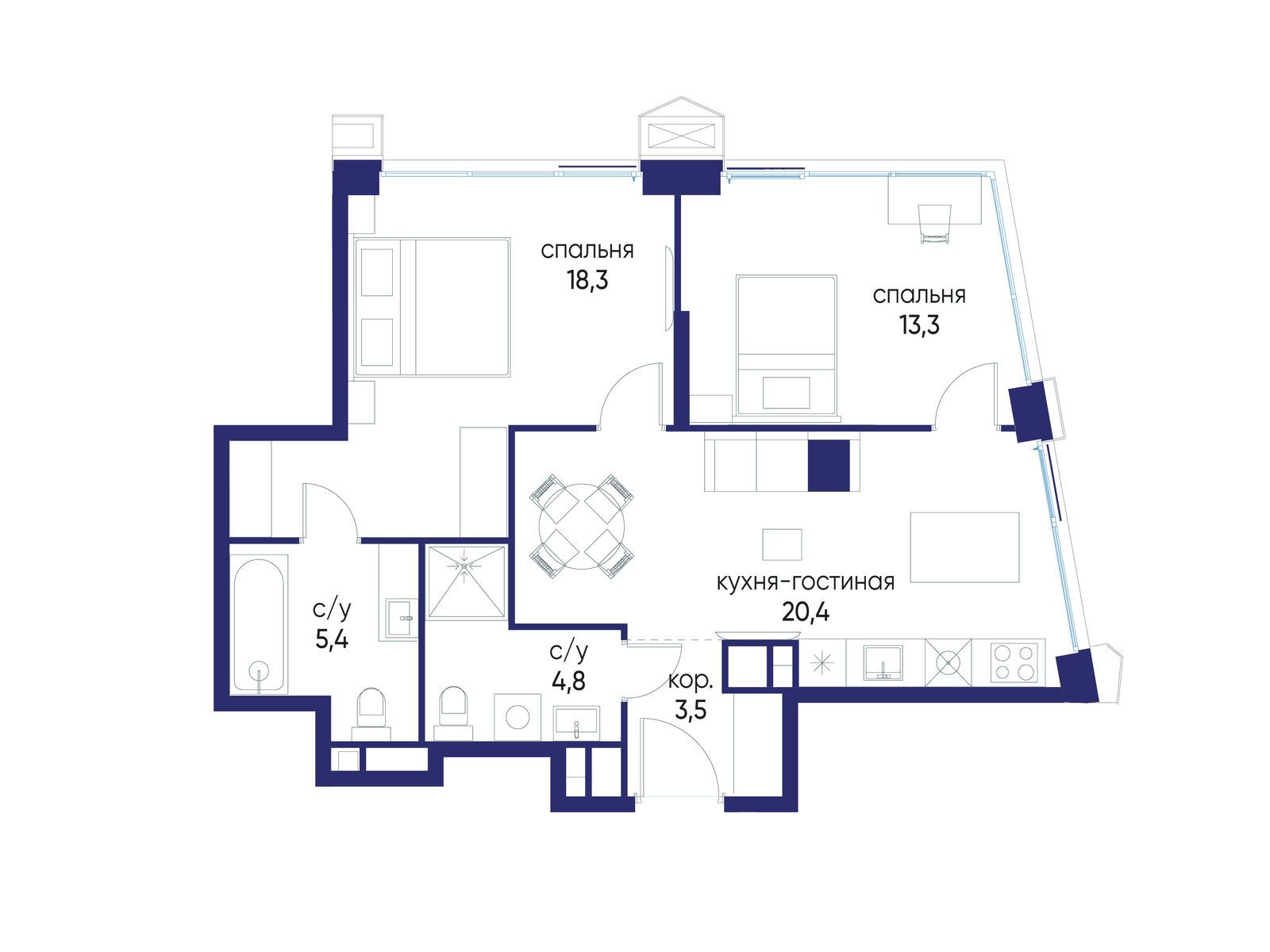 - Площадь кухни 20.4 м²