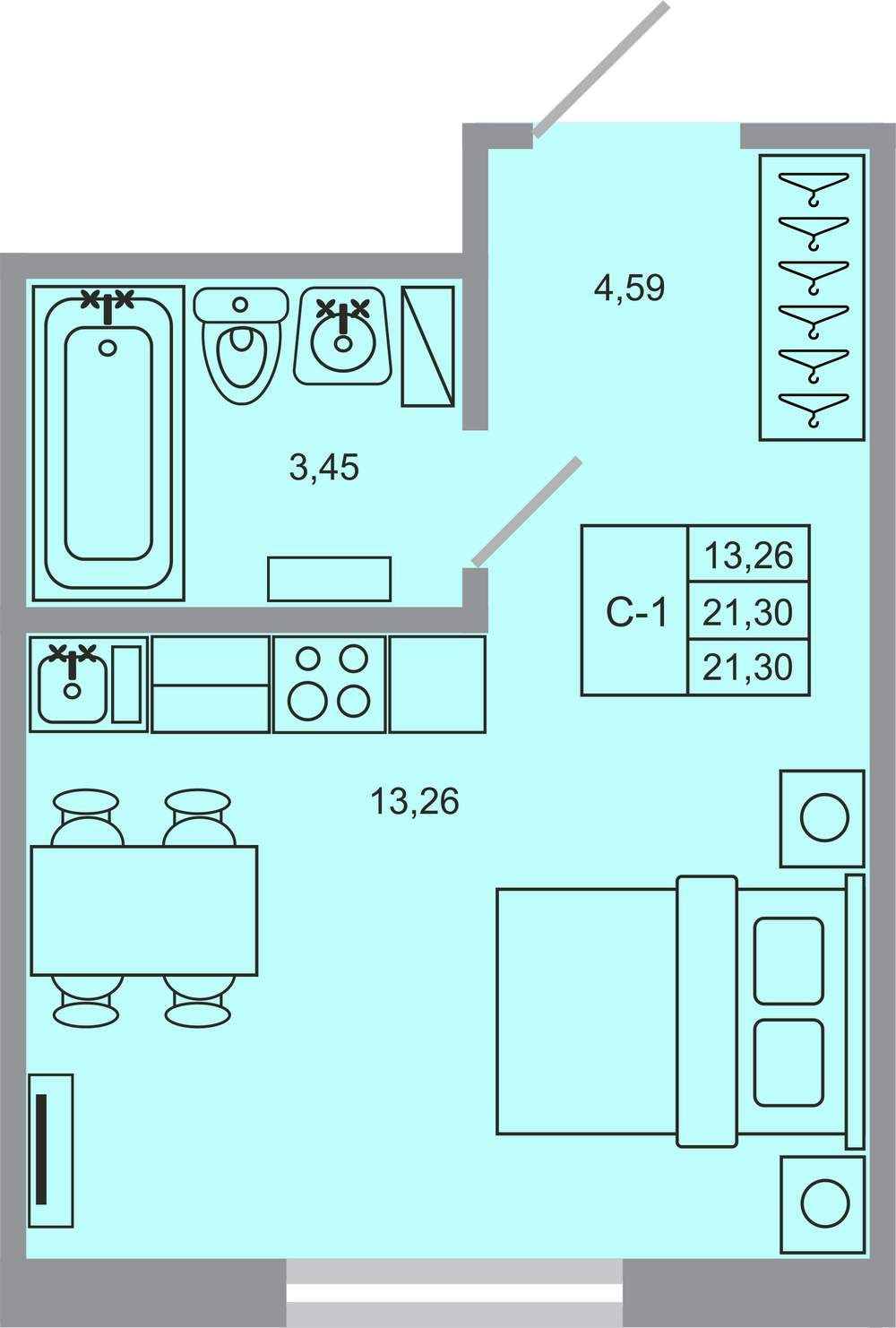 - Общая площадь 21.3 м²