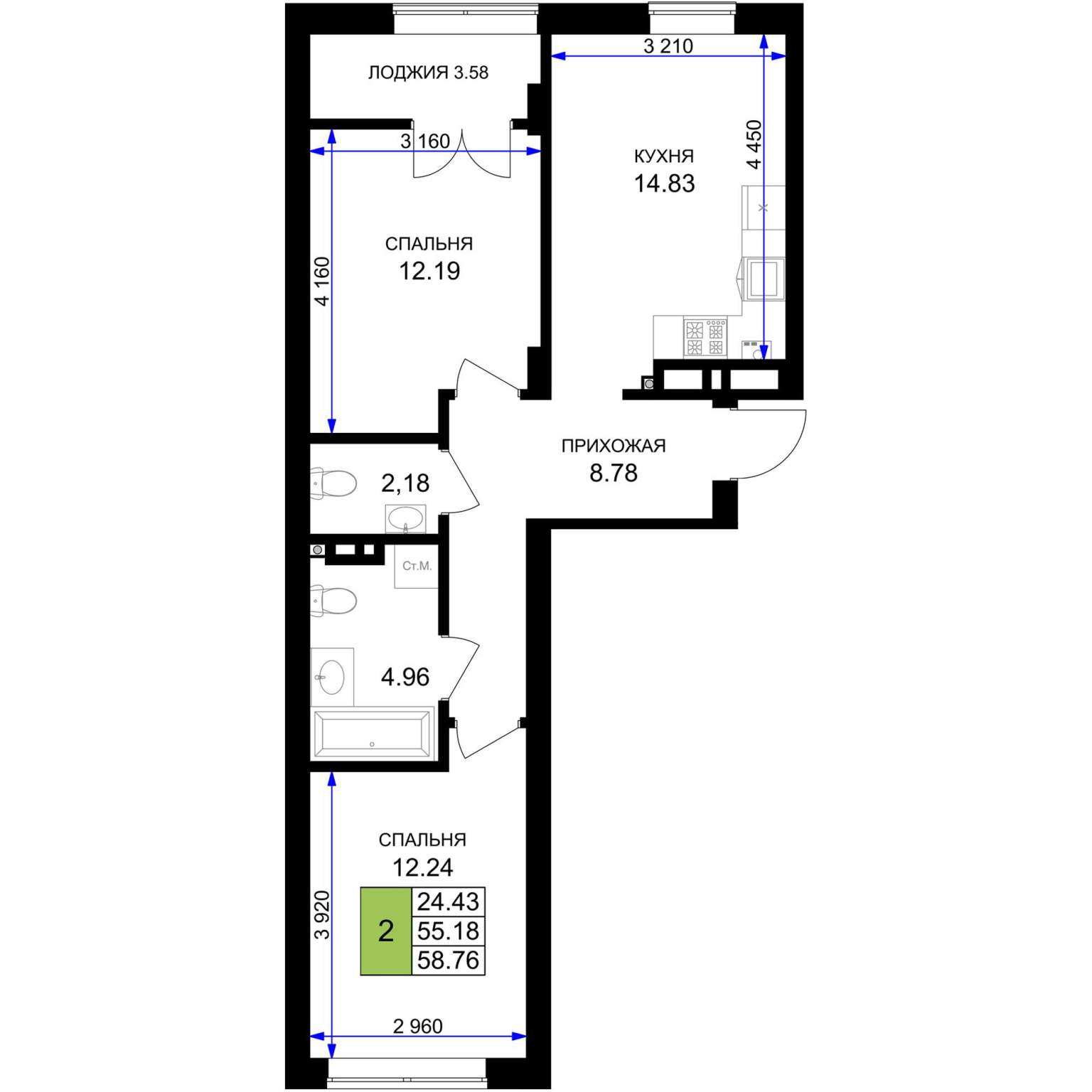 - Жилая площадь 24.43 м²