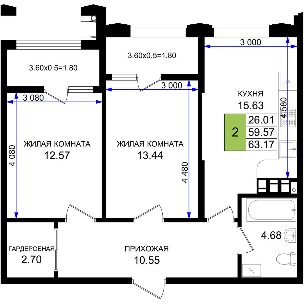 - Общая площадь 63.17 м²