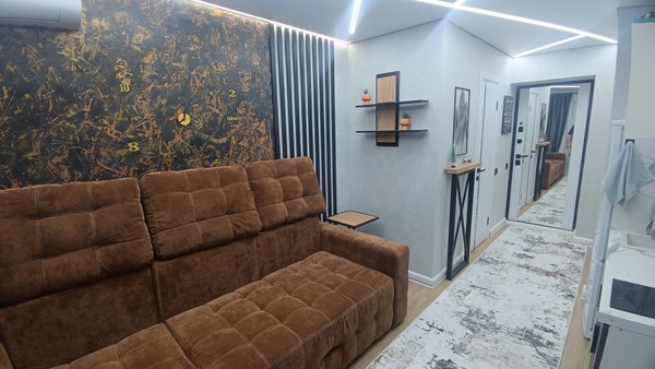 Планировка продуманная: прихожая с просторным шкафом‑купе, жилая зона с диваном и оборудованная кухня.